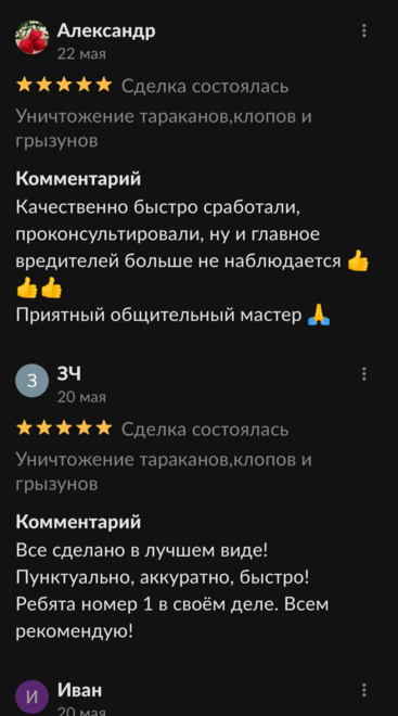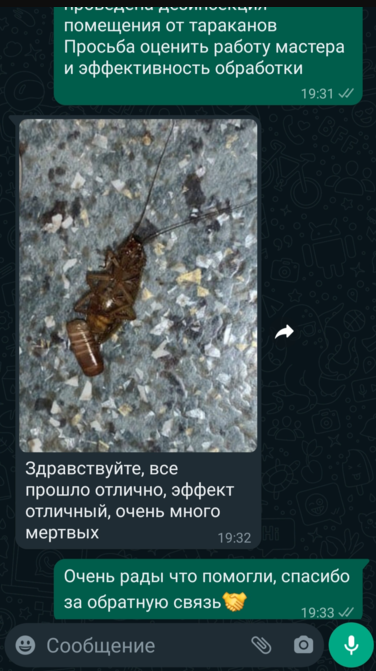 Дезинсекция занимает разное количество времени. Это зависит от площади квартиры или другого объекта, а также от популяции вредителей. В среднем, чтобы обработать однокомнатную квартиру, мы затрачиваем полтора-два часа.